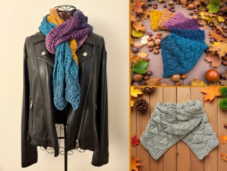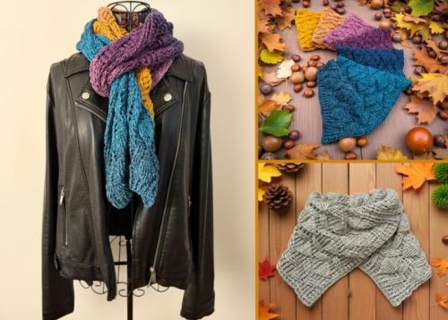Das Schal am Titelbild hat folgende Abmessungen: 24 x 150 cm. Der Klappschal hat folgende Abmessungen: 23 x 64 cm.