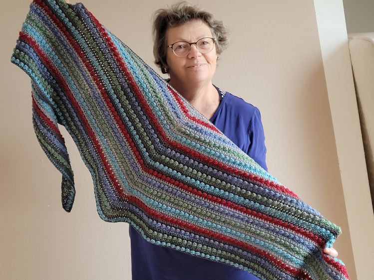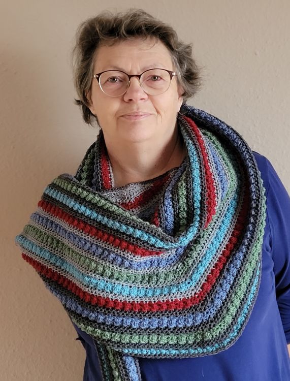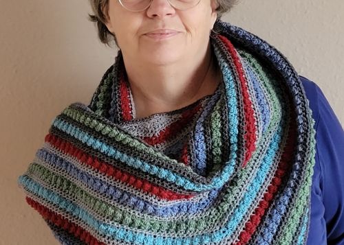 Ein neues schmales Tuch hat meine Werkstatt verlassen. Gehäkelt in 6 wunderbaren Farben und mit einem einfachen Häkelmuster. Die Bobbel entstehen durch jeweils 3 zusammen abgemaschte Stäbchen im Wechsel mit festen Maschen. Und sie werden beim Häkeln auf der Rückseite sichtbar.