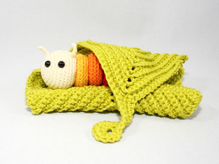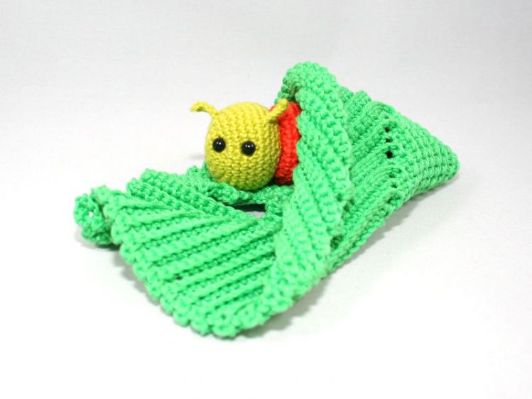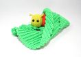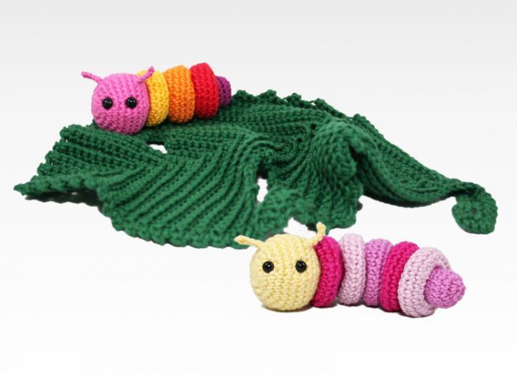 Ein süßes Schnuffeltuch in Form einer kleinen Raupe auf ihrem Blatt.