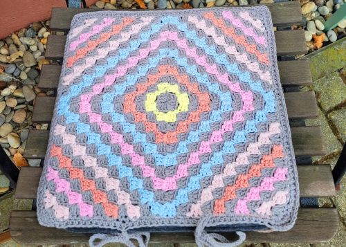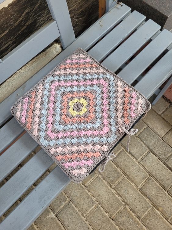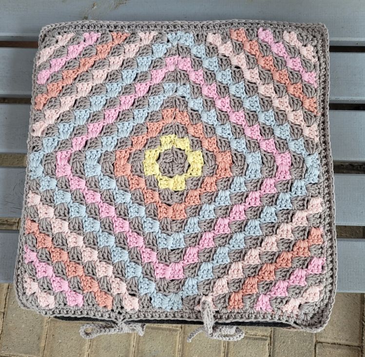 Ich habe ein quadratisches Sitzkissen umhäkelt, das du in jedem Bau- und Möbelmarkt kaufen kannst.