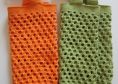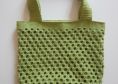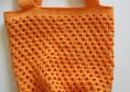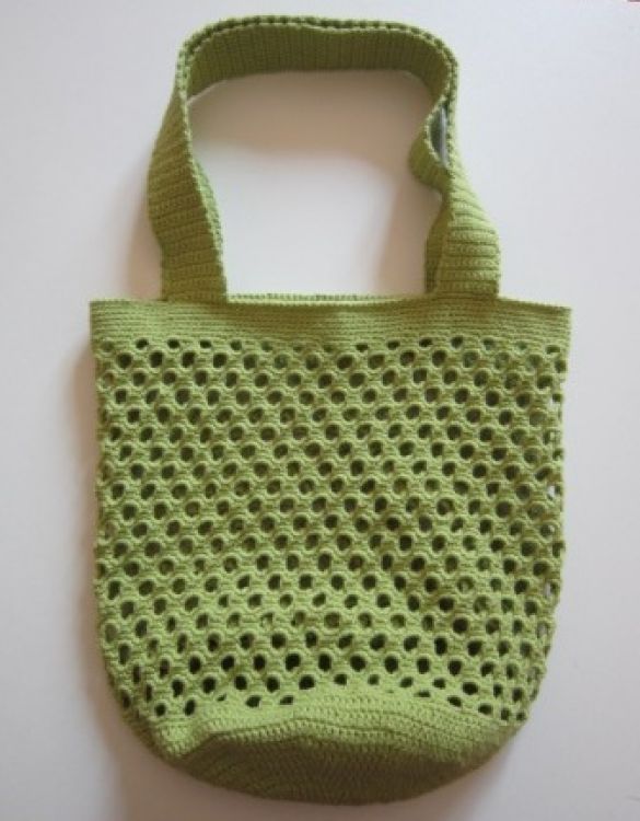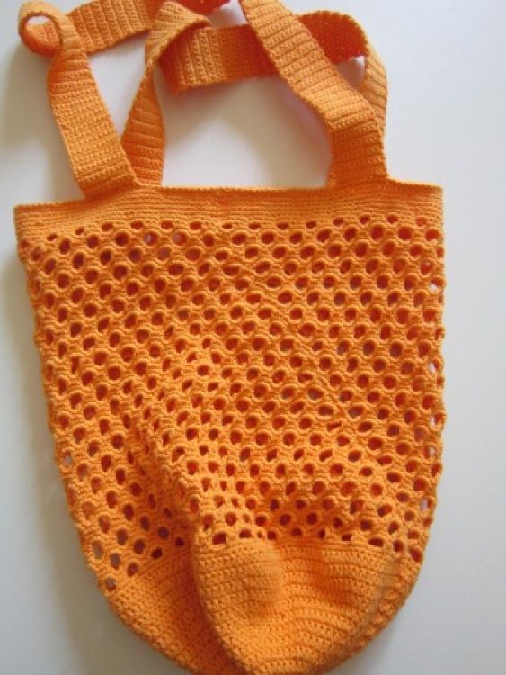 Bei mir ist der Beutel 30 cm x 39 cm groß ((ungedehnt und ohne Henkel). Verwendet habe ich das Baumwollgarn Drops Safran, LL 160m/50g, und eine Häkelnadel 2,5.