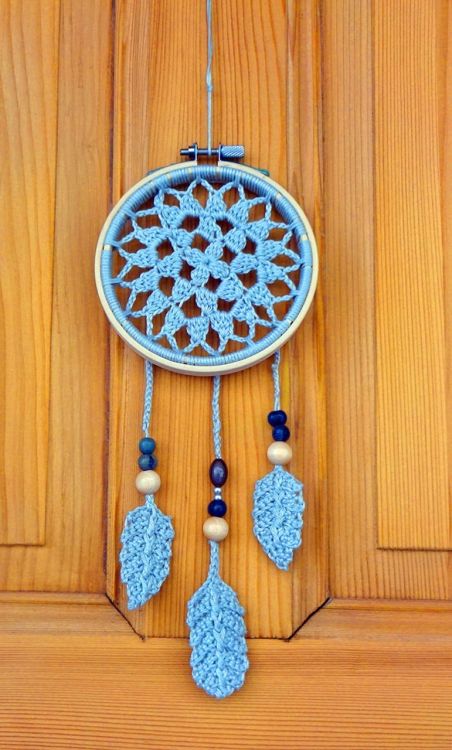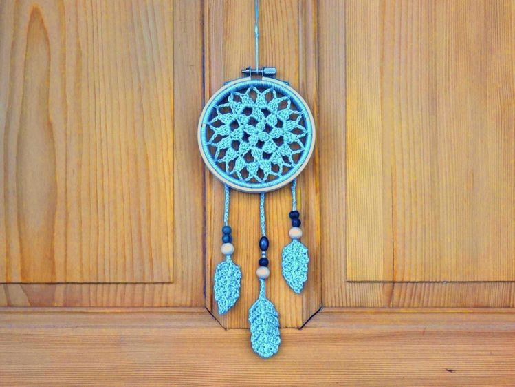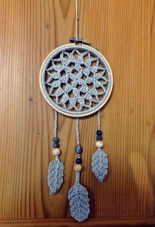 Mein Traumfänger in silbergrau oder auch in einer anderen Farbe ist mit 5 Runden schnell gehäkelt. Der Rahmen aus Holz ist eigentlich ein Stickrahmen mit dem Durchmesser 10 cm.