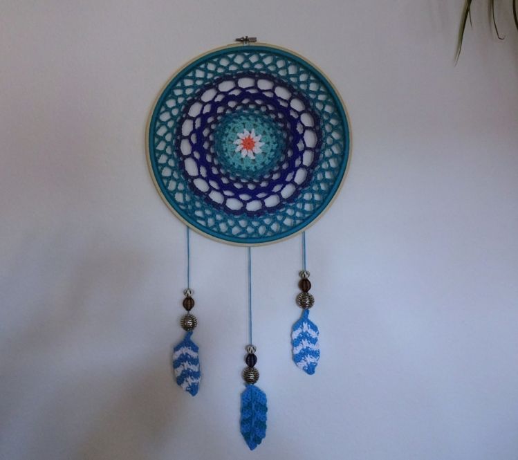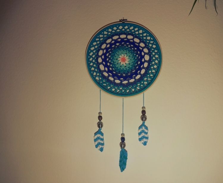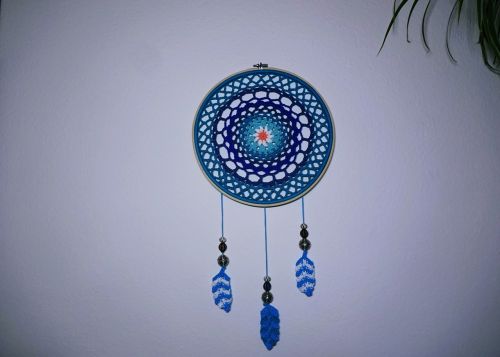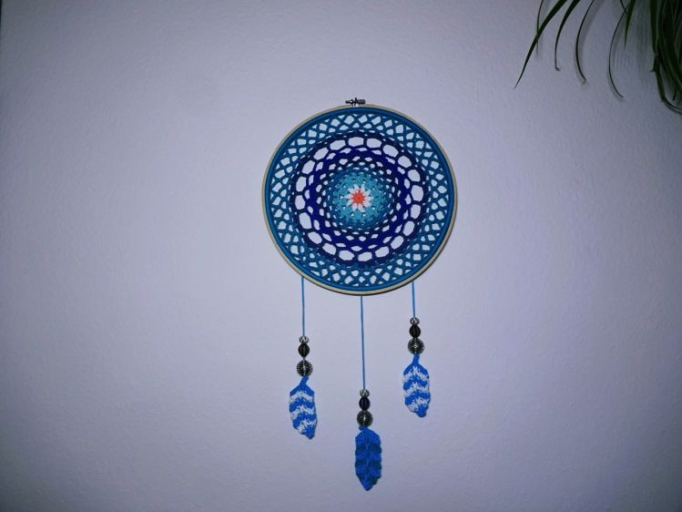Ein großer, in vielen blauen Farben gehaltener Traumfänger. Für alle Schlafräume und auch für jedes Kinderzimmer geeignet. Ein wundervolles Geschenk für sich selber oder einen lieben Menschen.