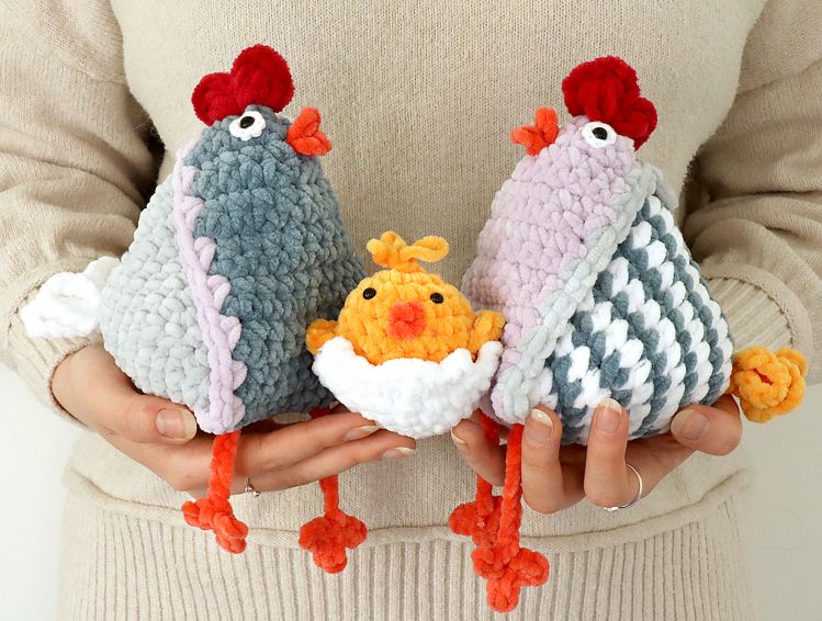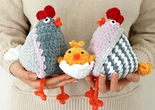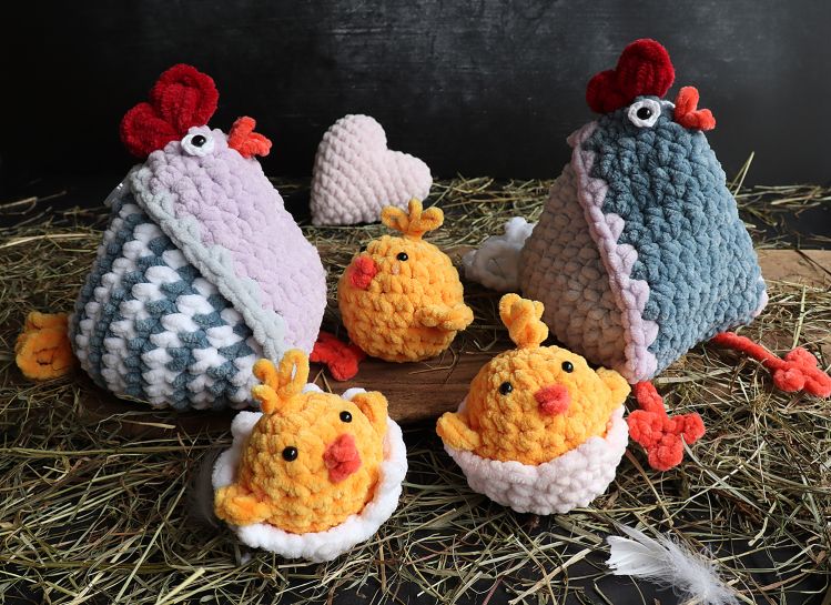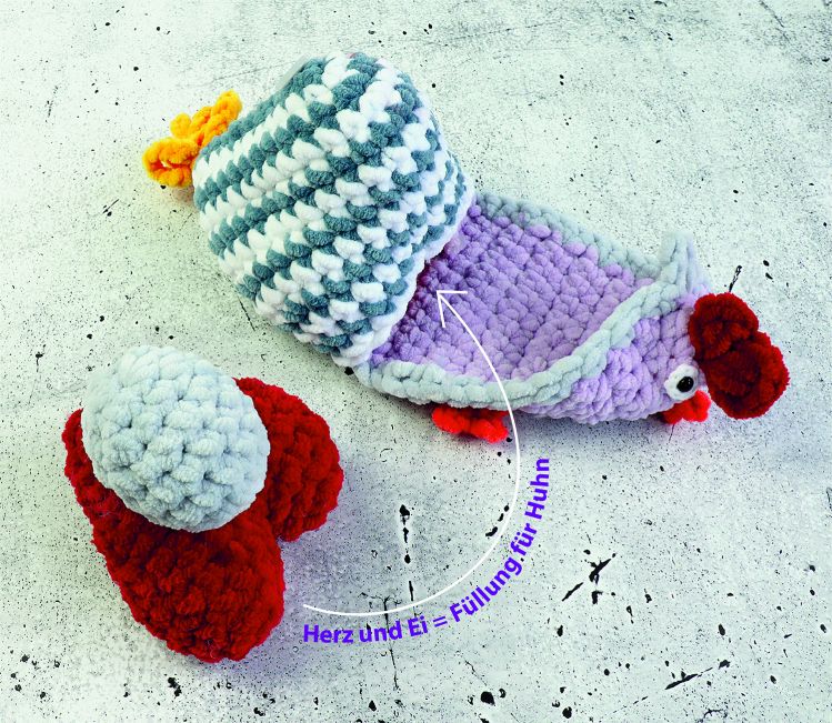 Die Anleitung umfasst das Huhn in zwei Varianten - mehrfarbig gestreift oder mehrfarbig ohne Streifen. Dazu gibt es die Anleitung für die Küken mit Eierschale, das Herz und das Ei.