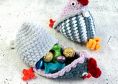 Und mit von der Partie sind die super putzigen kleinen Küken in ihren Eierschalen - hier ist die Besonderheit, daß die Flügelchen direkt mit eingehäkelt werden. So sparst du dir auch hier das Annähen.