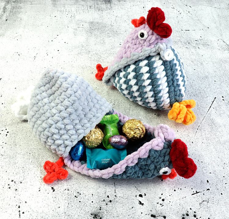 Nun gibt es die beliebten befüllbaren Hühner auch in groß. Schnell gehäkelt mit dicker Chenillewolle hat es genau die richtige Größe für ein paar Ostersüßigkeiten. Natürlich kannst du auch Geiheimbotschaften, Geld, Gutscheine, Schmuckstücke, ein Seidentuch, eine Krawatte, Socken oder sonstige Kleinigkeiten darin verstecken und verschenken.