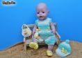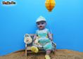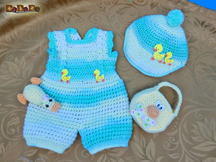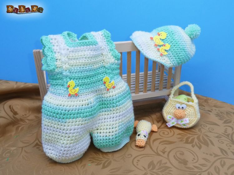 mit Hosen-Anzug, Mütze, Tasche und putzigem Entchen.