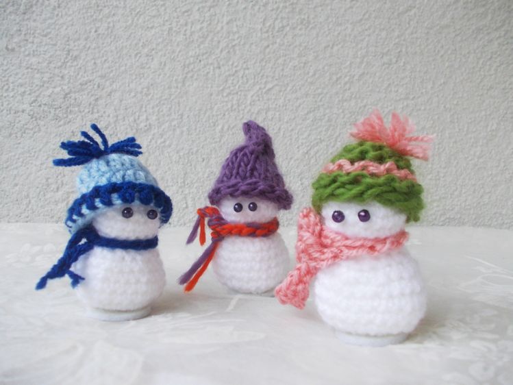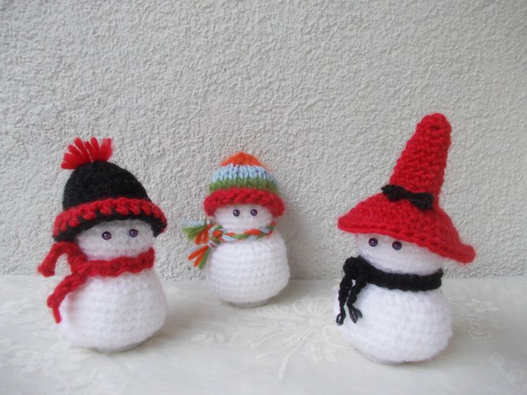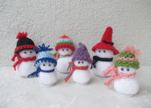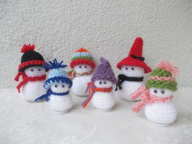 Die Figuren werden in einem Stück gehäkelt, es geht ruckzuck. Kleine Schals und Mützchen werden gehäkelt und gestrickt, die Accessoires sind Vorschläge von mir, auch farblich.