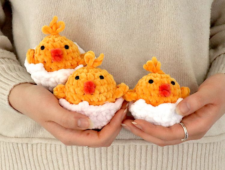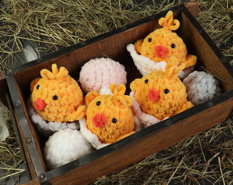 Schnell und einfach mit dicker Chenillewolle sind die knuffigen kleinen Küken gehäkelt - hier ist die Besonderheit, daß die Flügelchen direkt mit eingehäkelt werden. So sparst du dir das Annähen. Die Eierschalen und Eier sind ebenso schnell und einfach gearbeitet - ein super Projekt für Anfänger.