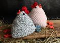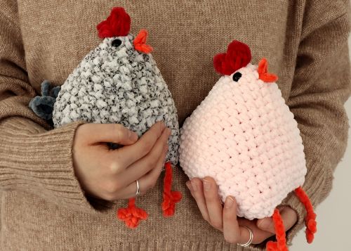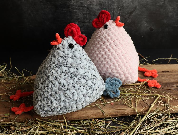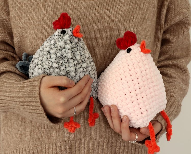 So schön frech, knuffig und weich sind diese Hühner, dass man sie einfach lieb haben muss. Mit der dicken Chenillewolle gehen sie wirklich flott von der Hand und sind ein wunderbares Wochenend- ober Abendprojekt. Der Körper wird in Runden mit festen Maschen gehäkelt, die Schwanzfedern und der Kamm werden direkt an den Körper gehäkelt. Die Beinchen sind zusammenhängend und werden mit eingearbeitet. So musst du am Ende lediglich den Schnabel anbringen und eine Naht schließen, ansonsten ist kein Annähen nötig.