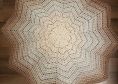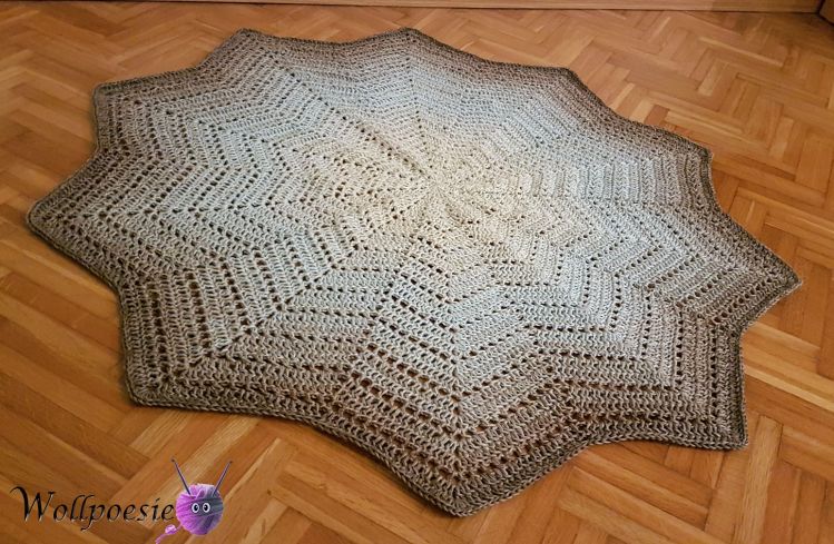 Die **Sternensplitter Decke** auf den Fotos wurde mit 780m 6 fädigem Farbverlaufsgarn und einer Häkelnadel der Stärke 4,5 gehäkelt.