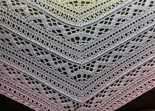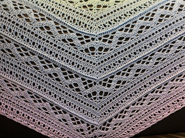Ich setzte mich eines Abends hin und entwarf dieses traumhafte Tuch. Ich war so begeistert von dem Muster, dass ich nicht mehr aufhören konnte zu häkeln. Als ich fertig war stand für mich fest, dass das Tuch „Sueño“ heißen soll. Obwohl es eine einfache Musterfolge hat, ist es ein echter Hingucker.