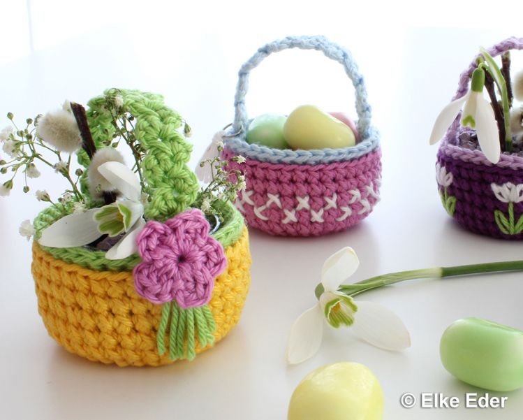 Die Körbe sind eine Kombination von festen Maschen (Innenkorb) und Doppelmaschen (Außenkorb) - dadurch sind sie wunderbar zum Besticken geeignet. Hier sind keine Grenzen gesetzt - du kannst sie wie gezeigt mit Kreuzstich oder Blümchen besticken, aber auch mit Zickzackstich, Hexenstich etc. Natürlich kannst du auch die Farben so variieren wie es dir gefällt.