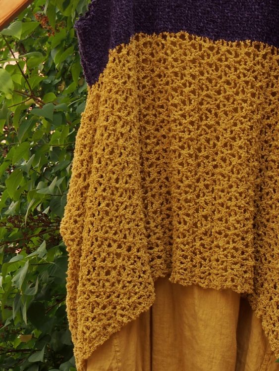 Die Bilder zeigen sie kombiniert zu einem schlichten gelben Lagenlook-Kleid als farblichen und strukturellen Akzent. Sie trägt sich aber auch wunderbar zu T-Shirt und Leggings, Caprihose oder Radler.