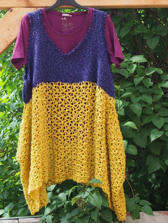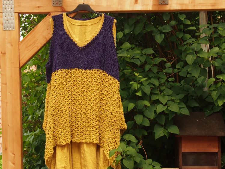 Summer yarns combined with a trendy crochet look and cotton with linen - a colorful tunic fitting expecially good to layered look.