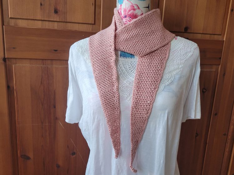 The Julien Scarf ist ein kleiner schmaler Halsschmeichler, der gehäkelt ist. Das Muster nennt sich Webmuster, im Englischen auch Moss Stitch genannt. Es beginnt schmal, wird an der breitesten Stelle nur 11 cm breit und wird danach wieder schmal. Alles weitere findest du in meiner Anleitung, die im Text ohne Abkürzungen auskommt und mit vielen Detailbildern unterstützt wird. Verwendet wird dünnes Garn aus Baumwolle oder einer Garnmischung zur Häkelnadel 3,5 passend.