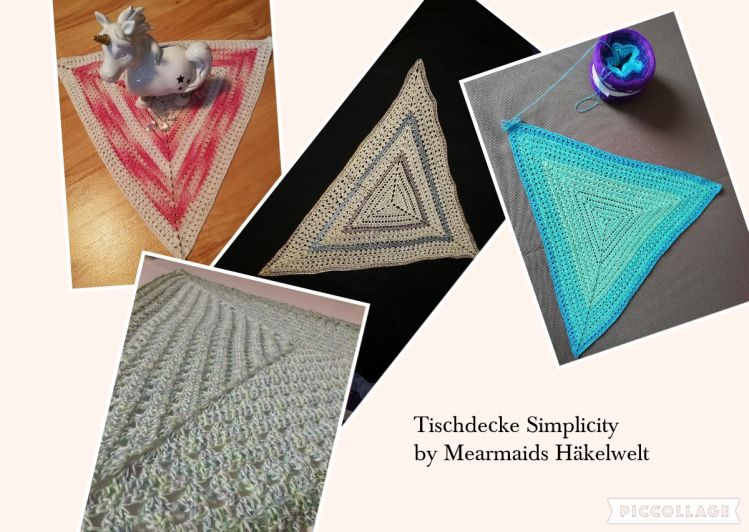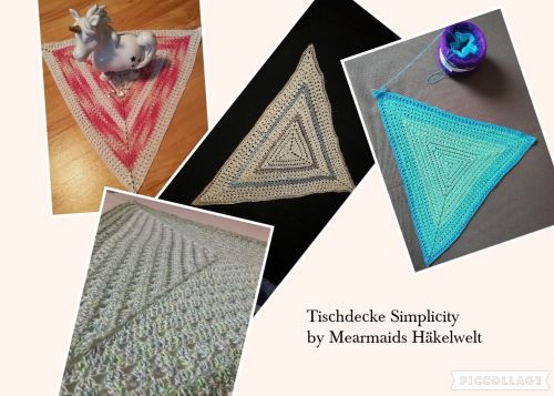 Die Tischdecke Simplicity ist hat ein einfaches und eingängiges Muster, welches aus 3 verschiedenen Elementen besteht. Sie kann als kleines Deckchen, das heißt einmal alle Muster durch, gehäkelt werden, wobei eine ungefähre Größe von ungespannt etwa 70-80cm entsteht, je nach Festigkeit der Häkelarbeit, oder aber mit beliebig vielen Wiederholungen in beliebiger Größe gearbeitet werden.