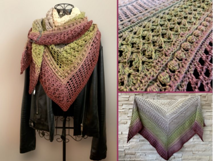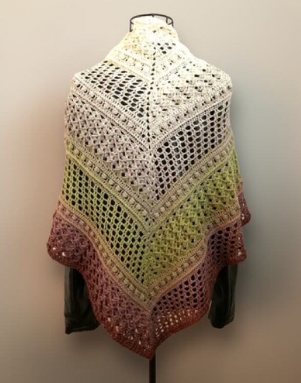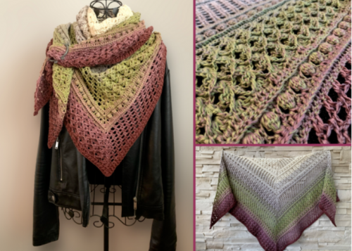 The triangular scarf Elektra ist a wonderful scarf, ideal for summer evenings and autumn. The 3D shell pattern is an eyecatcher, as the rows always contain two different patterns sets, you will not get bored crocheting it!