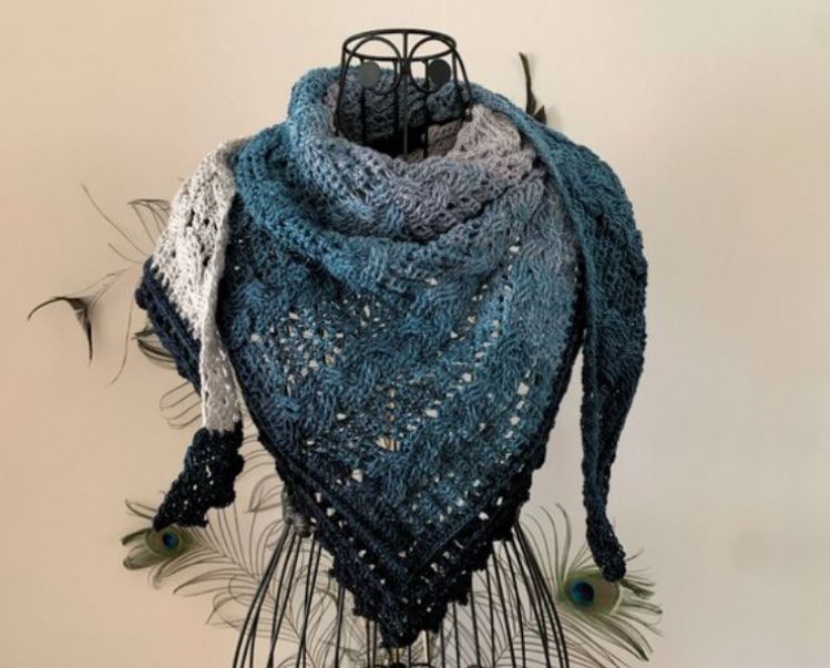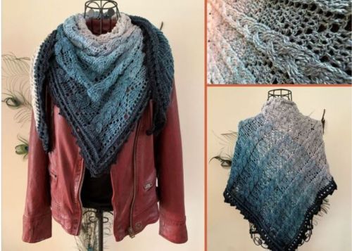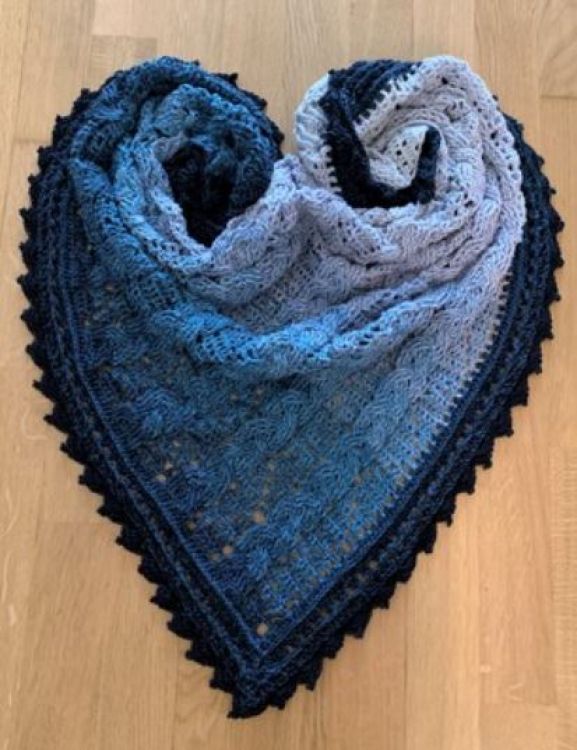 Ein wunderschönes, neues Dreieckstuch "Kabye" ist fertig, es besticht durch ein auffälliges, verspieltes Zopfmuster, das aber nicht zu schwer/dicht ist, da es durch ein freches Zackenmuster durchbrochen ist. Der wunderschöne Rand ist ein Blickfang.