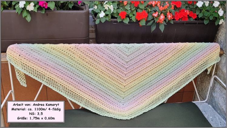 Hier erhälst du die Anleitung für das Tuch "Sonnenuntergang" in einer dreieckigen, flachen Version sowie eine Kurzanleitung für eine asymmetrische Form.