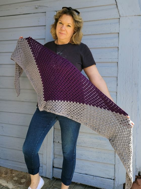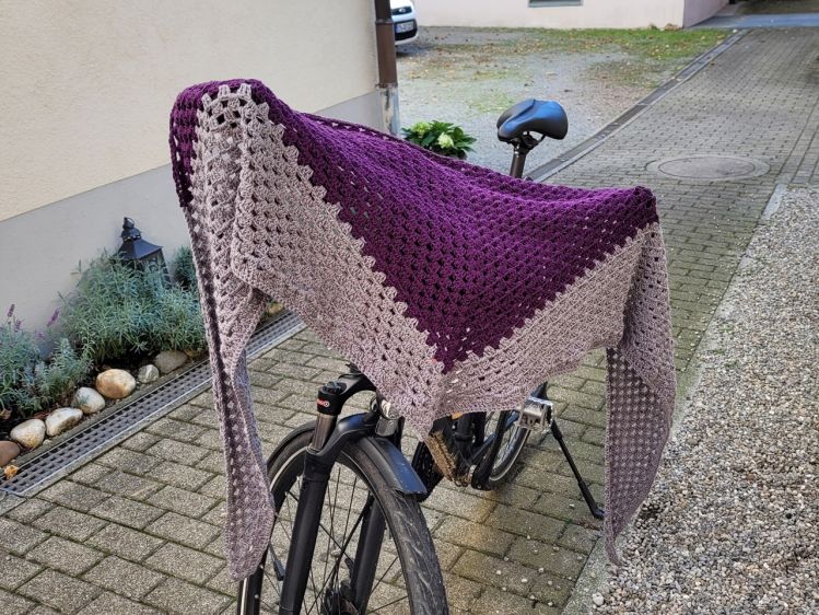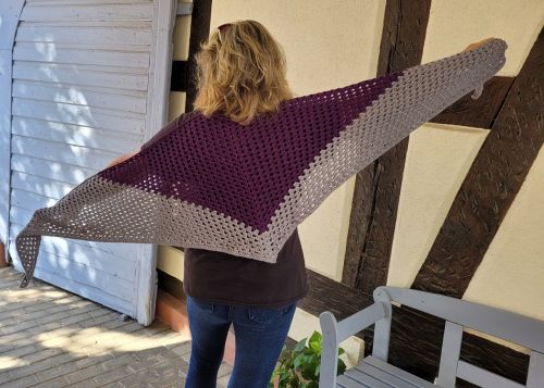 Das Häkeltuch Mathea ist ein Granny Tuch mit verlängerten Spitzen. Das wird mit verkürzten Reihen gearbeitet und ist nicht so kompliziert, wie es sich liest. Und damit die langgezogenen Tuch Zipfel besonders auffällig sind, werden sie in einer anderen Farbe gehäkelt.