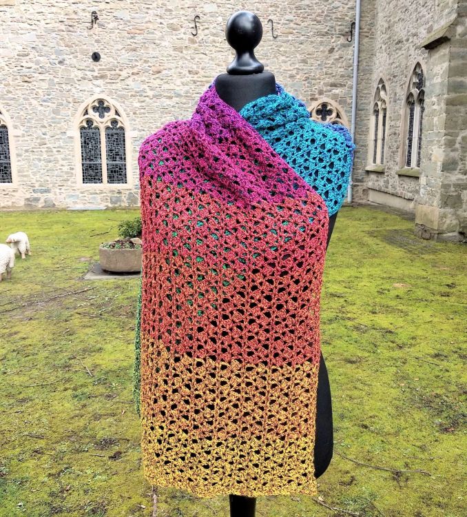 Man kann die Rechteckform in beliebiger Größe häkeln, als Stola oder Schal. Dafür gibt es detaillierte Hinweise, die es leicht machen, die gewünschte Größe zu häkeln und die richtige Garnmenge zu kaufen.
