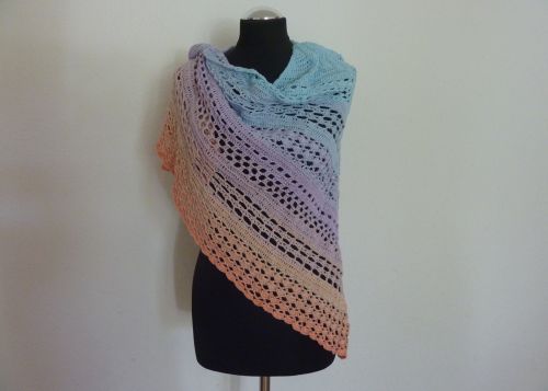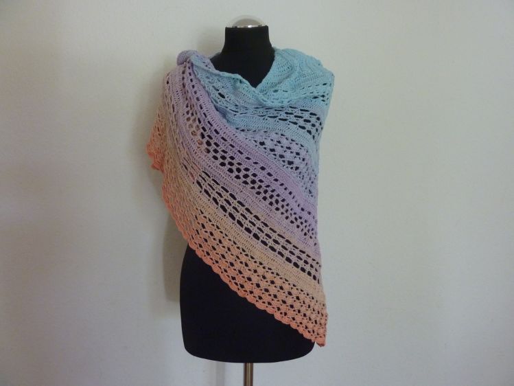 Das Tuch "Softly" mit seinen zarten Farben und verschiedenen Häkelmustern ist ein richtiger Hingucker und ein Begleiter für einen Abendspaziergang genauso wie ein Begleiter im Alltag.