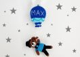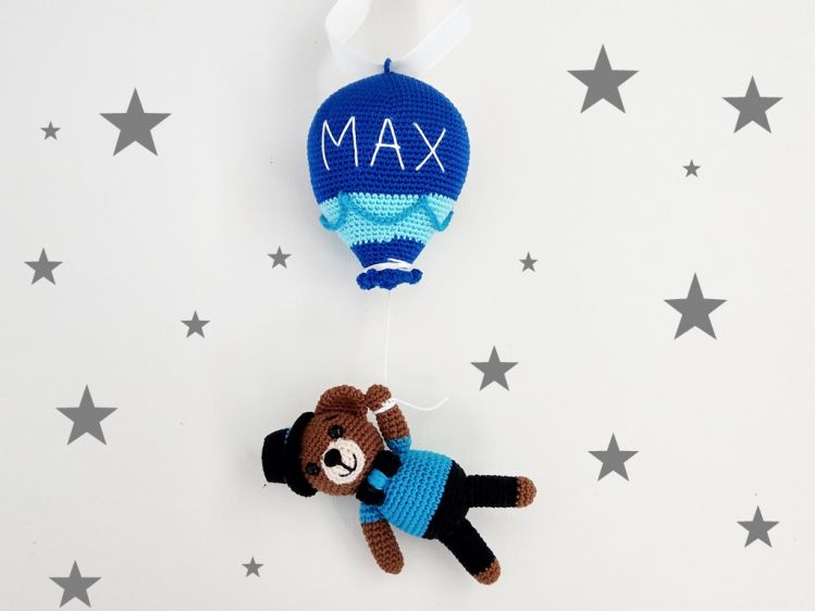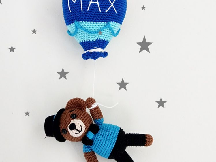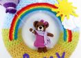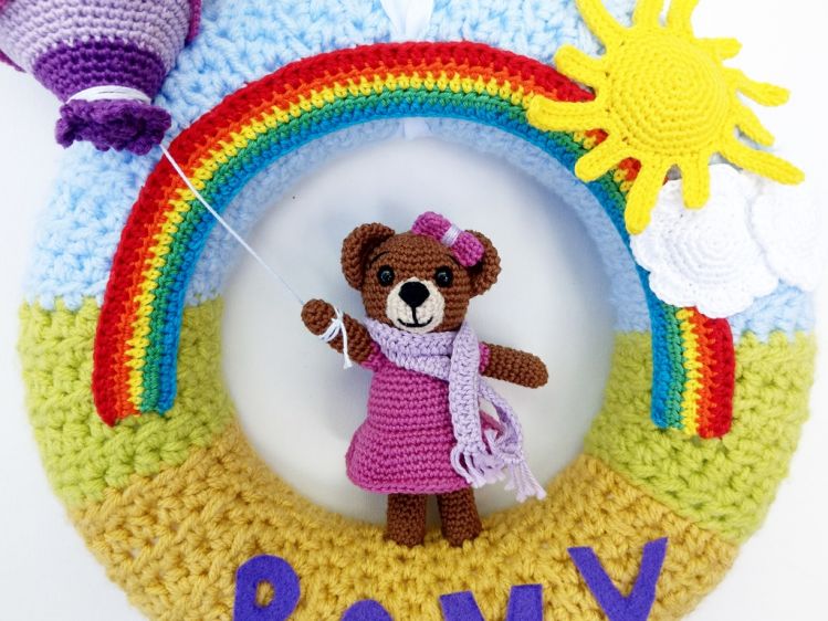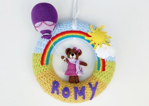 Das kleine Bärchen steht in mitten eines Weizenfeldes unter einem Regenbogen. In seiner Hand hält das Bärchen ganz stolz und fest einen großen Luftballon