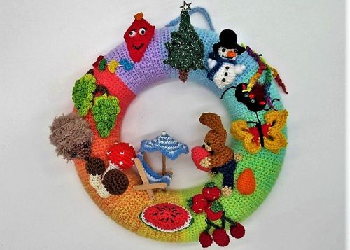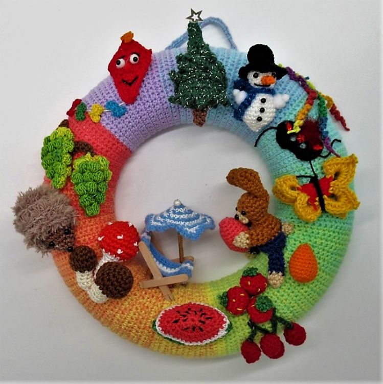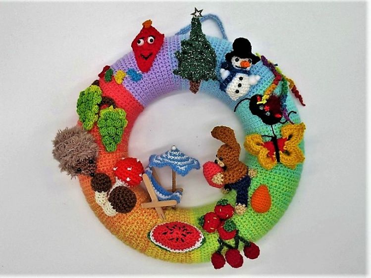 Der Verlauf eines ganzen Jahres auf einem Türkranz: Diese Häkelprojekt wird dir viel Spaß machen, denn es ist sehr abwechslungsreich. Der kranz ist in 12 Abschnitte geteilt - für jeden Monat des Jahres einen. Für die vielen kleinen Details kannst du sehr gut deine Wollreste verwenden. Das von mir verwendete Garn habe ich jeweils dazu angegeben.