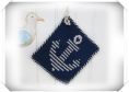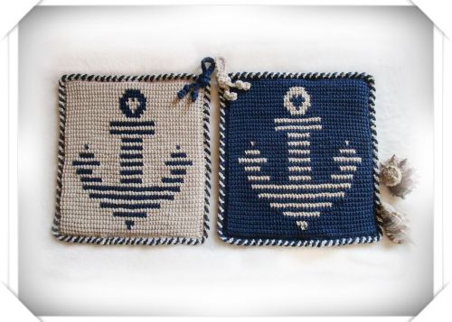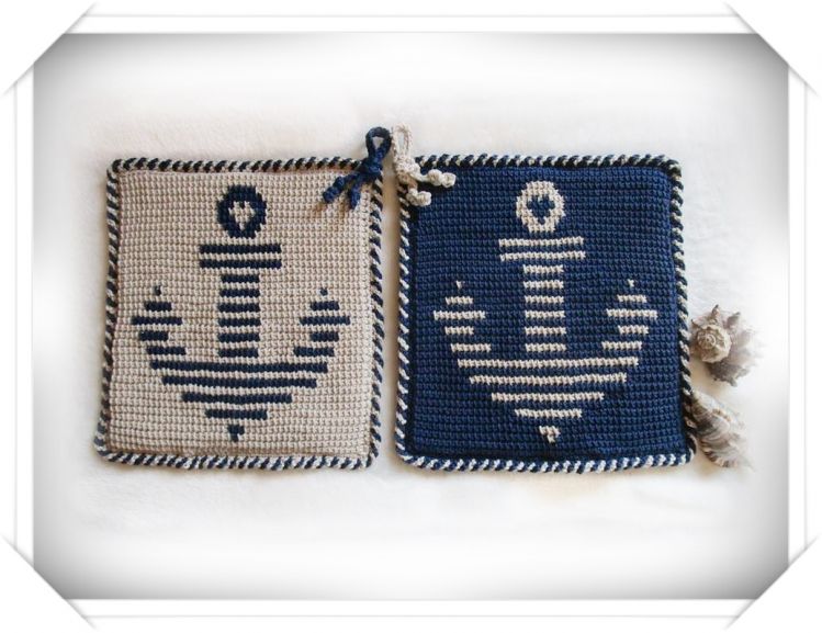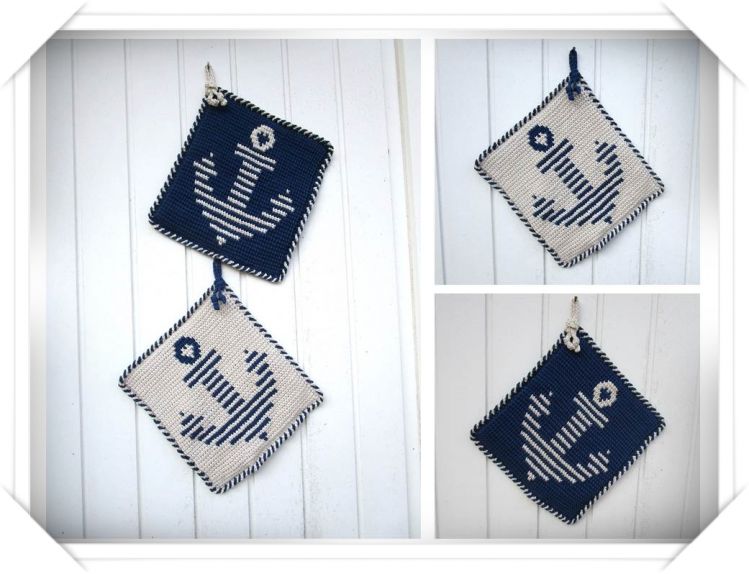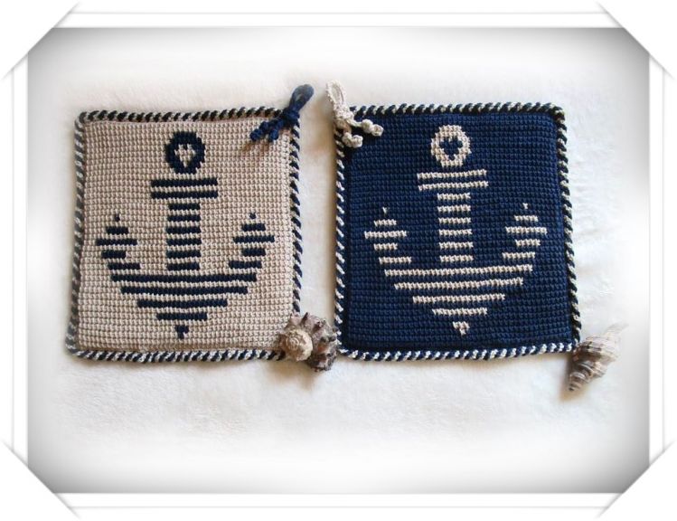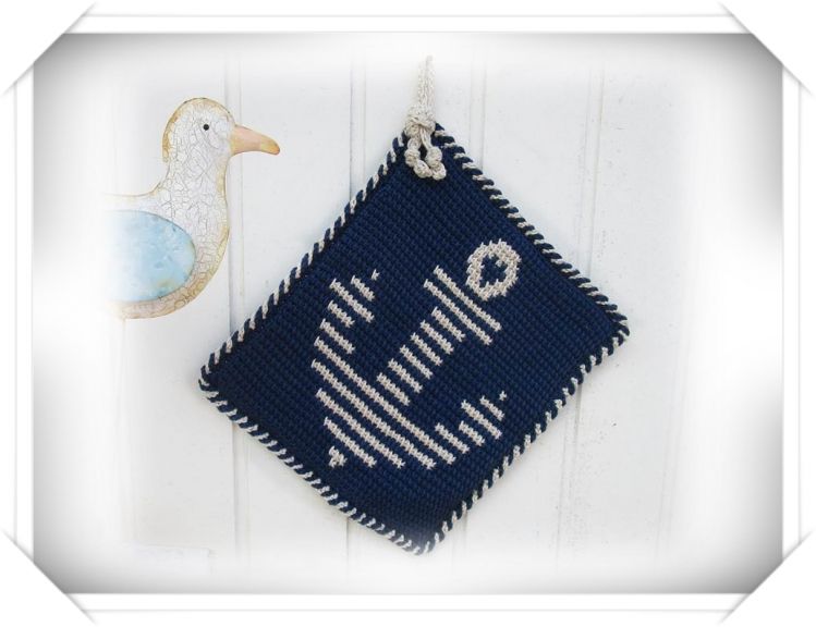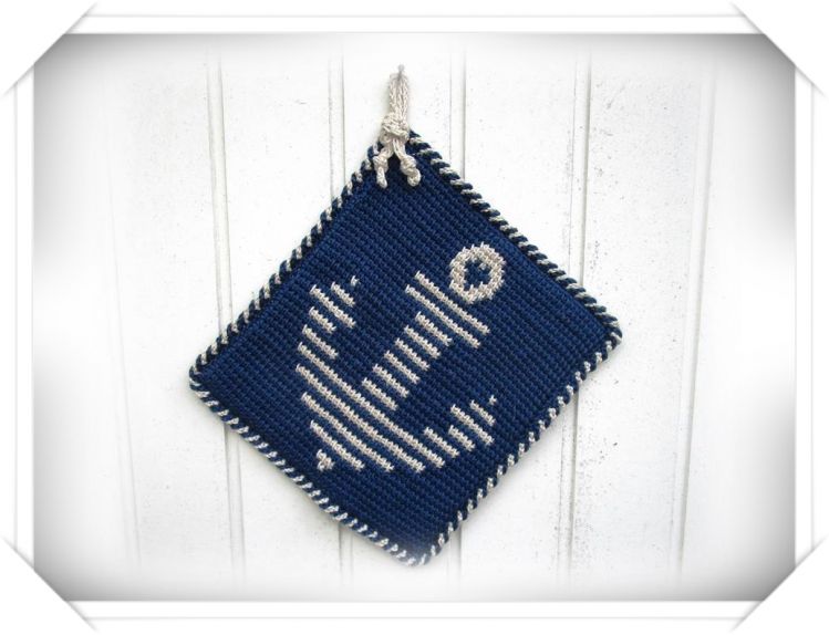 Er besteht aus 2 Hälften, die Vorderseite ist mit eingehäkelten Ankermotiv und die Rückseite ist einfarbig. Durch den dekorativen Kordel Rand werden die Teile miteinander verbunden und ein kleines gehäkeltes Seil mit Knoten dient als Aufhänger.