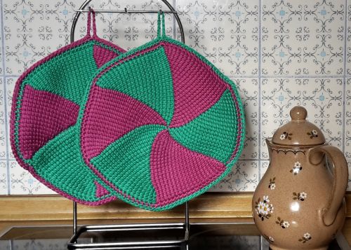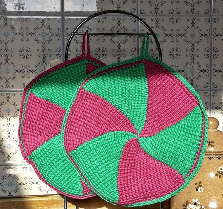 Meine sind aus dickem Garn im tunesischen Grundmuster gearbeitet.