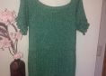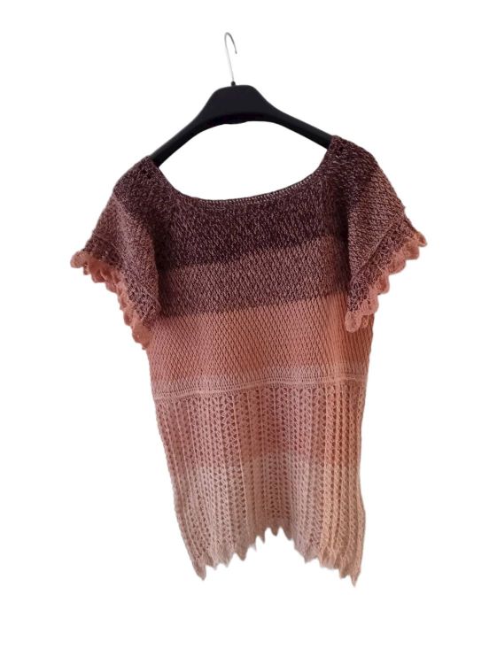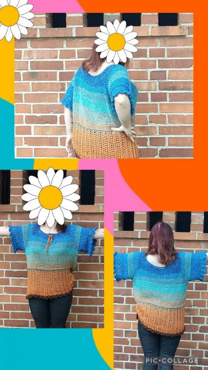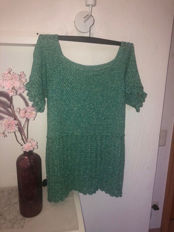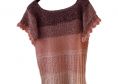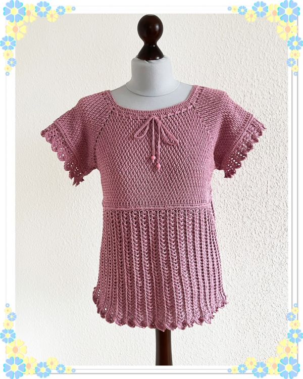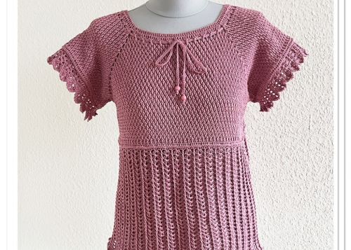 Die Tunika wird als RVO (Raglan von oben) in Runden gehäkelt. Sie beginnt am Halsausschnitt und wird von dort aus in Reihen ohne zu wenden nach unten gehäkelt. Der Brustbereich wird im alpinen Muster gehäkelt (1 Stb, 1 VRStb im Wechsel), was sehr blickdicht ist. Der restliche Teil ist luftig.