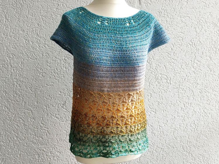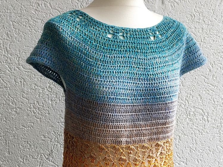 Die Tunika „Frühlingsduft“ wird von oben nach unten gearbeitet. Wir häkeln eine Rundpasse.
