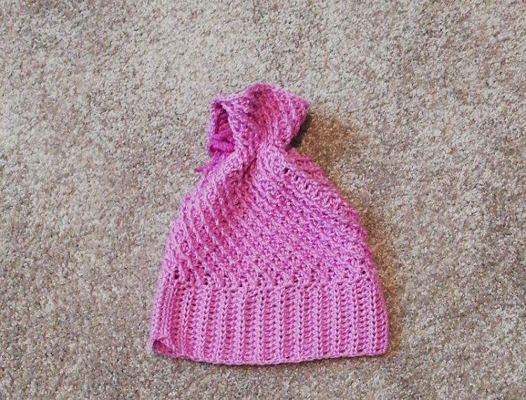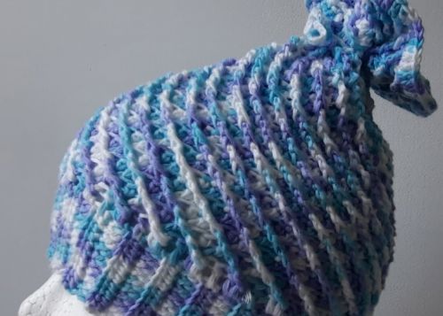 Es wird erst ein Bündchen gehäkelt, woran dann die Mütze in Runden angehäkelt wird. Es wird nicht gewendet und es gibt keine Zu- oder Abnahmen! Das macht die Mütze auch für Anfänger leicht nachzuhäkeln.