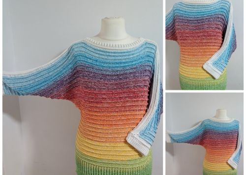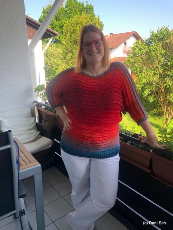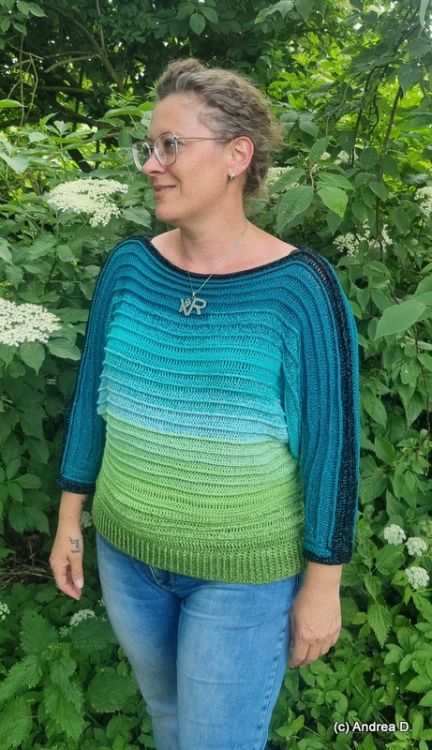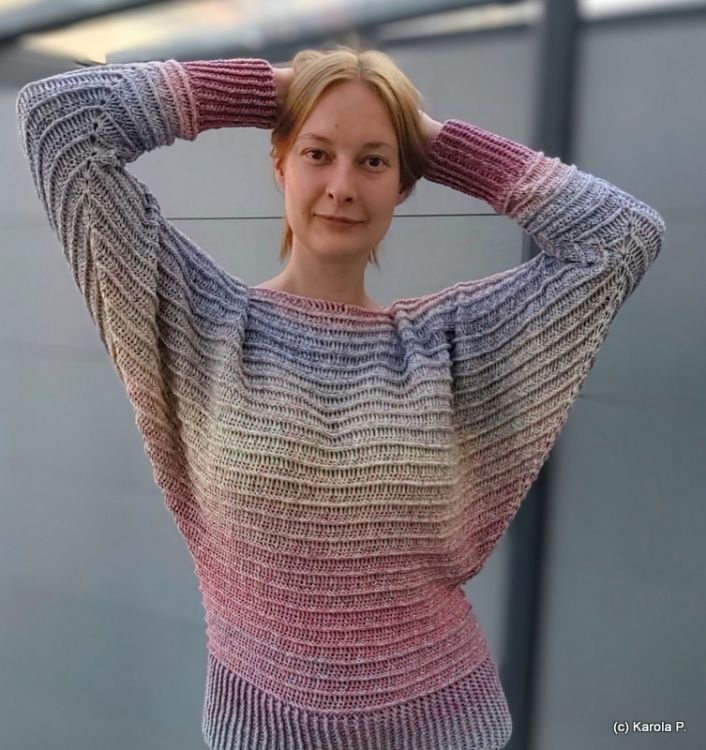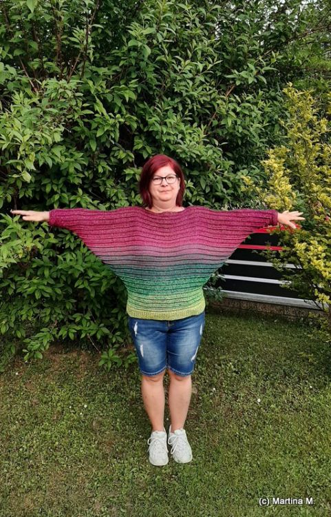 Vladik ist ein Fledermauspullover der von unten nach oben in einem gearbeitet wird. Man kann daher auch gut einen einzigen Bobbel verarbeiten ganz ohne extra Armwicklungen.