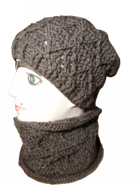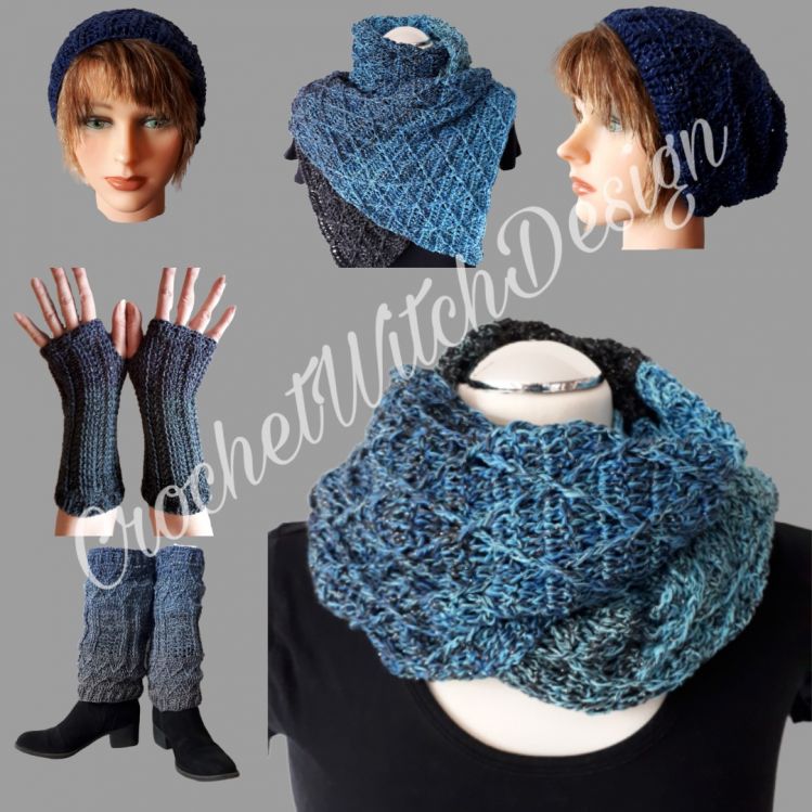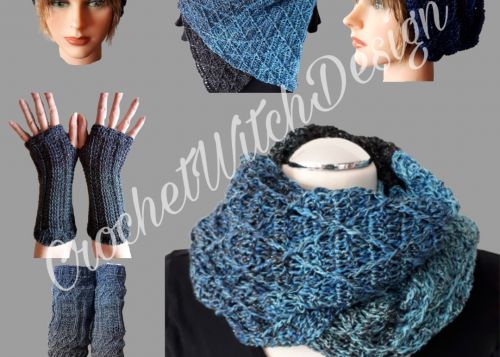 Set besteht aus: Beanie/Mütze, Arm- und Beinstulpen und einem Loop/Schal. Die Muster ergänzen sich und sind austauschbar, so kann jeder gestalten wie er/sie möchte.