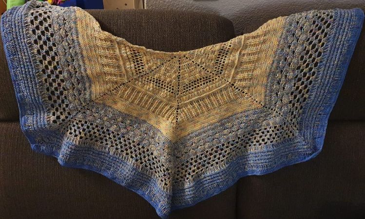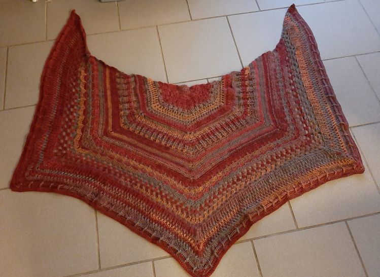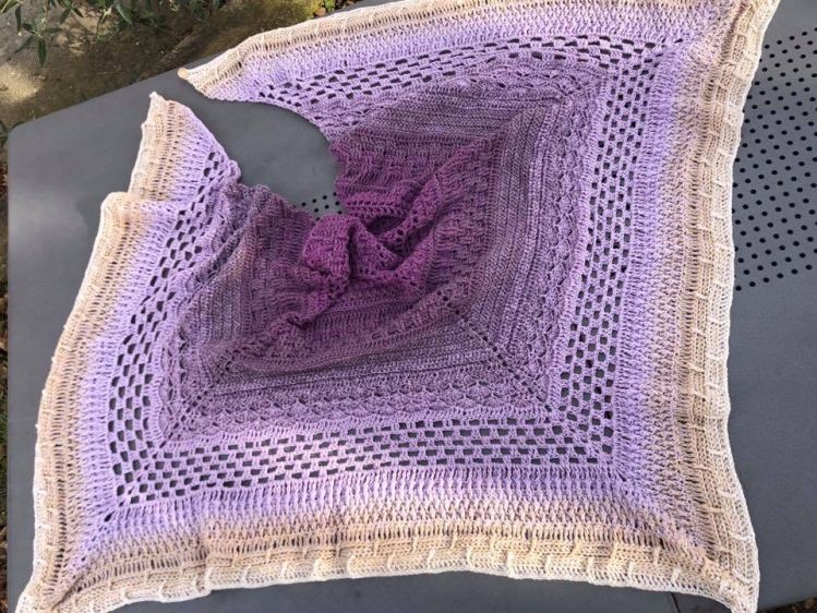 Es besteht aus einem Mustermix von recht dichten Mustern, sodass es gut für kühle Abende und auch im Winter zum Wärmen geeignet ist.