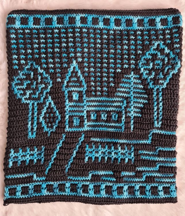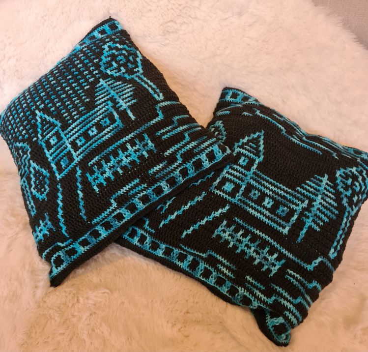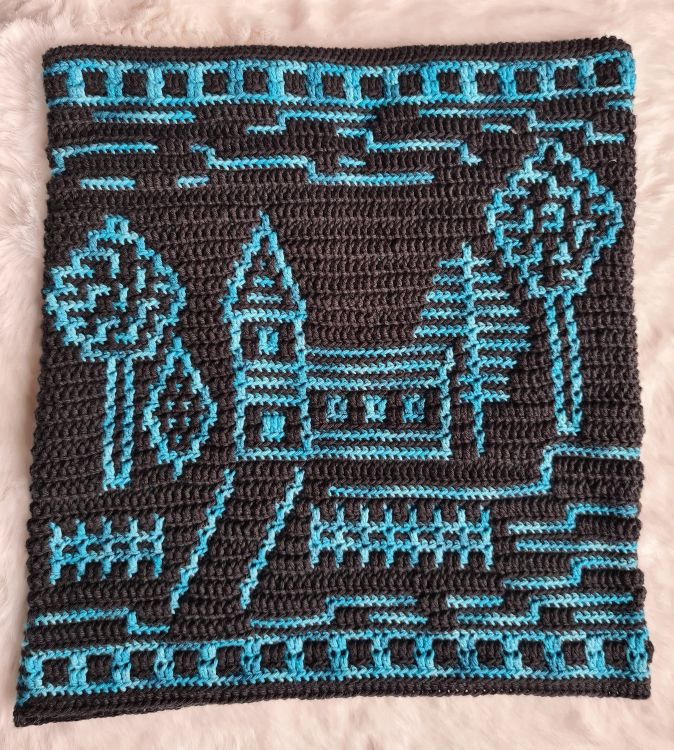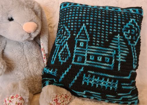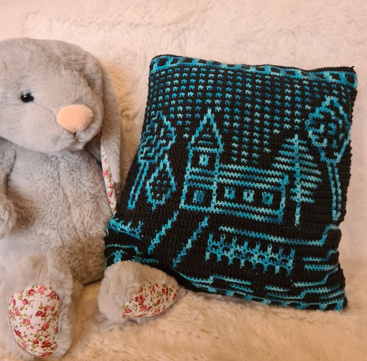 Das Motiv ist auf der Vorderseite des Kissens, die Rückseite wird mit festen Maschen ins hintere Maschenglied durchgehäkelt.