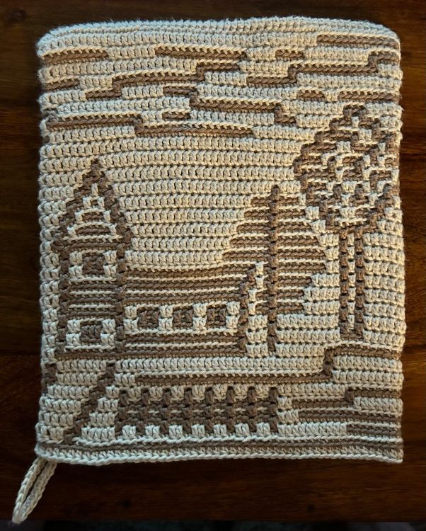 Auf den Bildern wurde diese Variante als Waschhandschuh mit verkürzten Reihen in Beige-Braun gehäkelt.
