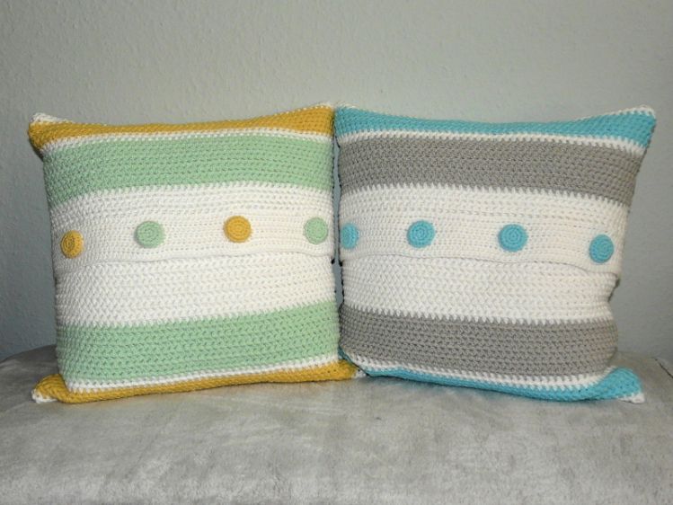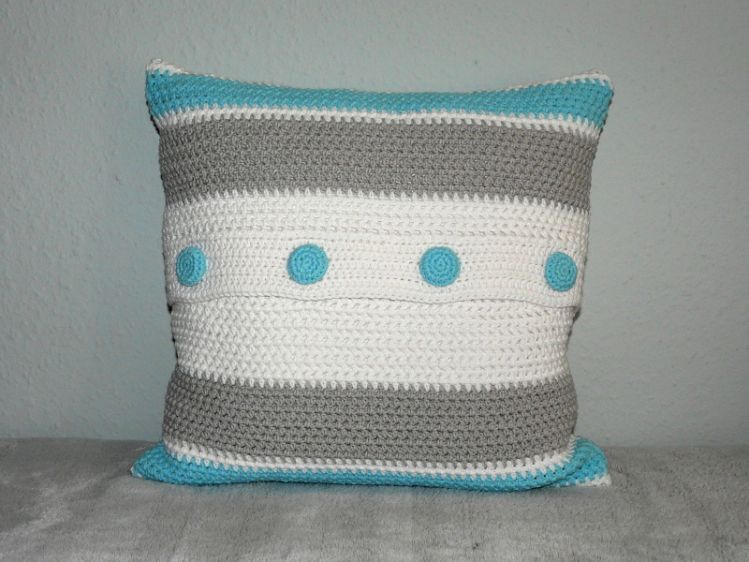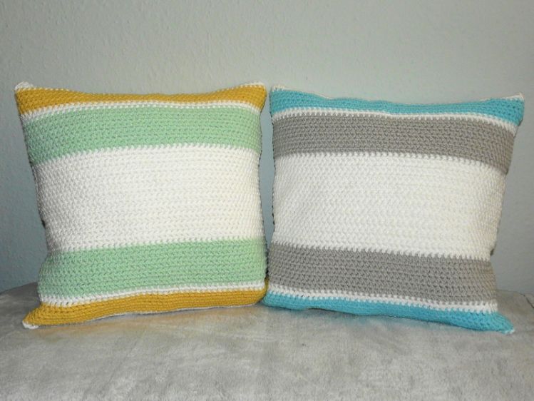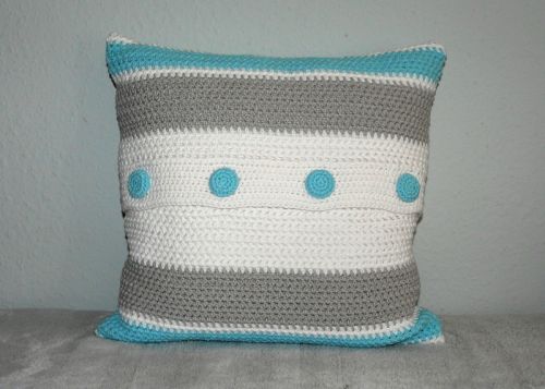 Dieses tolle Kissen ist im handumdrehen gehäkelt und sieht durch das dezente Muster sehr schön aus. Das Kissen ist ein idealer Begleiter auf der Couch oder im Bett. Die Farben könnt ihr natürlich frei nach eurem Geschmack wählen. Die kontrastreichen Streifen verleihen dem Kissen seinen ganz besonderen Charme.