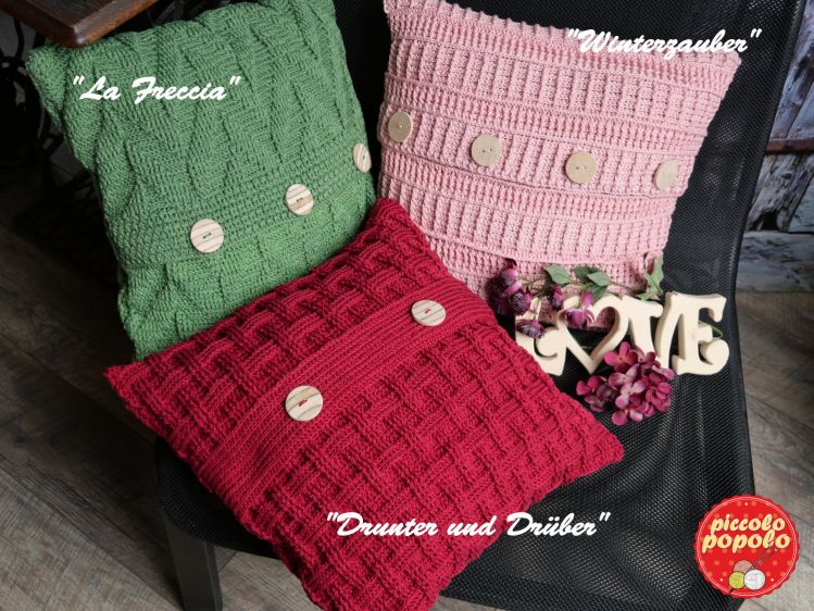 Aus dieser Serie gibt es vier weitere Kissenhüllen; „La Freccia“ (grün), „Drunter und Drüber“ (rot), "Verzopftes Drunter und Drüber" (beige) und "Winterzauber" (rosa).