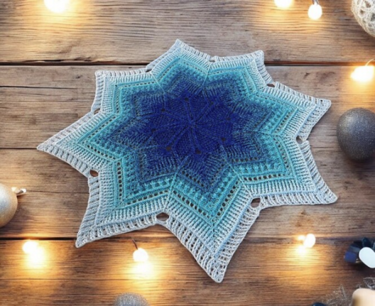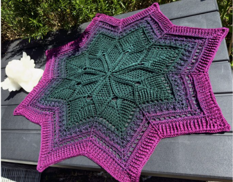 Sterope ist ein zauberhaftes Deckchen in Sternenform, ein Blickfang, der in beliebiger Größe gehäkelt werden kann.