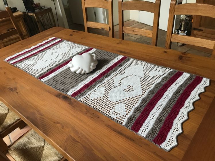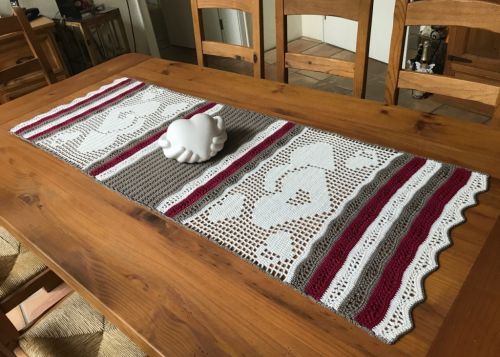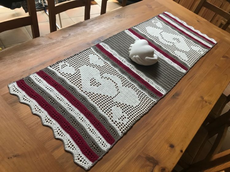 Der Tischläufer hat bei mir mit angegebener Wolle und Nadelstärke eine Größe von: 145x52 cm,