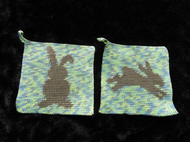 Easter and spring are coming: Potholder in doubleface technique with four different bunny silhouettes. With this technique, you can combine the motifs as you like.