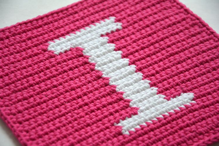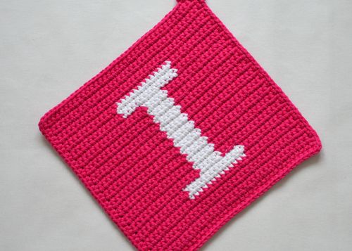 Neben der schriftlichen Anleitung für den Buchstaben-Topflappen sind ein Häkelschema in Farbe und ein Häkelschema in schwarz-weiß enthalten.