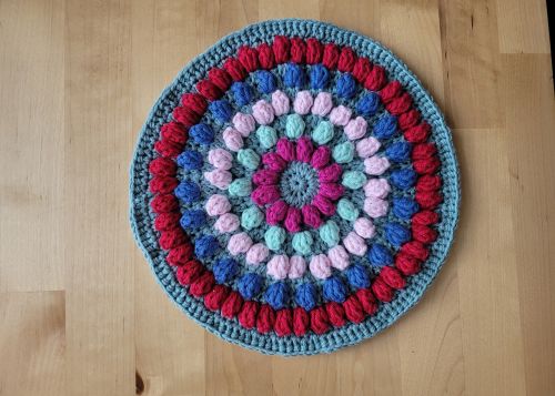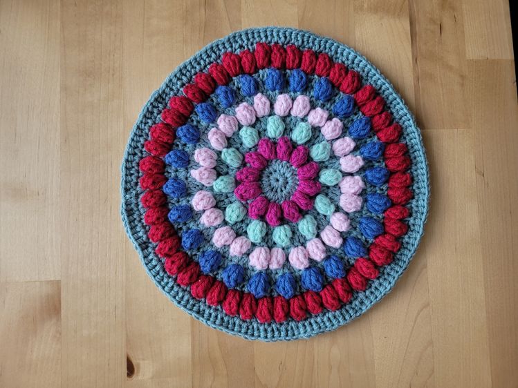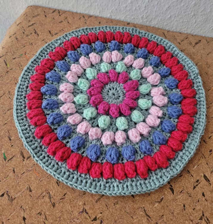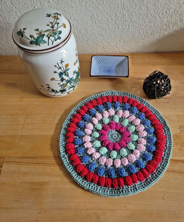 Häkle dir dieses Unikat in deinen Lieblingsfarben. Für die Küche, den Esstisch oder als Geschenk immer sehr passend. Die Popcorn- Maschen sind eine kleine Herausforderung, aber das lohnt sich, gibt es doch dem ganzen Teil eine schöne 3D- Optik.