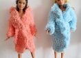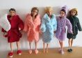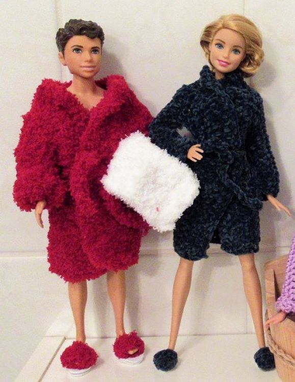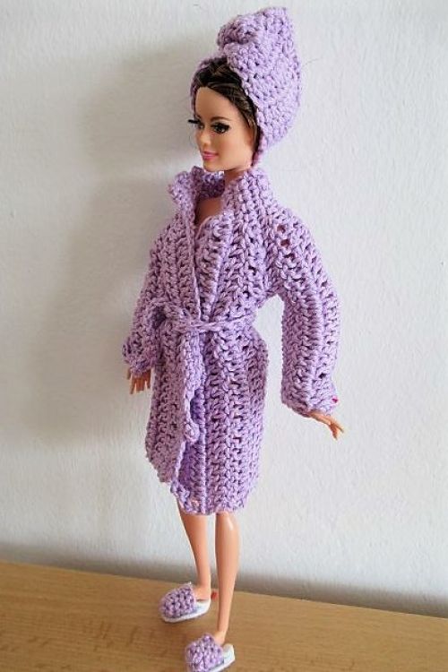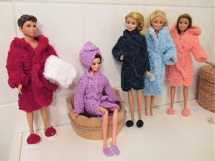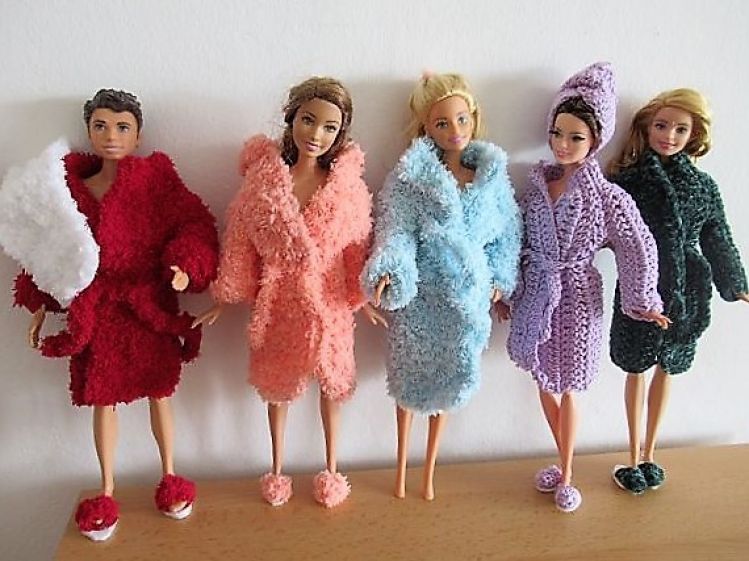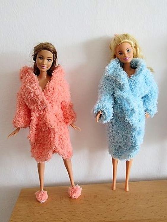 Der Bademantel für Barbiepuppen kann aus fast jedem Garn gehäkelt werden. Den besonderen Frotteeeffekt bekommst du,wenn du Teddygarn verwendest. Dazu gibt es in der Anleitung auch jede Menge Tipps. Material: ca. 20 - 25 g beliebiges Garn (LL zwischen 100 und 190 m pro 50 g) Moosgummi Heißkleber Beispiele: Es wurde verwendet: für den grünen Bademantel: Katia Velvet fine (LL 160m/50g) für den lila Bademantel: Schachenmayr Catania(LL 125m/50g) für den hellblauen Bademantel: Rico Baby Teddy (LL 145m/50g) für den apricotfarbenen Bademantel: Schachenmayr Lenja Soft (LL 85m/25g) für Kens Bademantel: Phildar Phil douce (LL 86m/50g)
