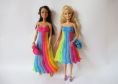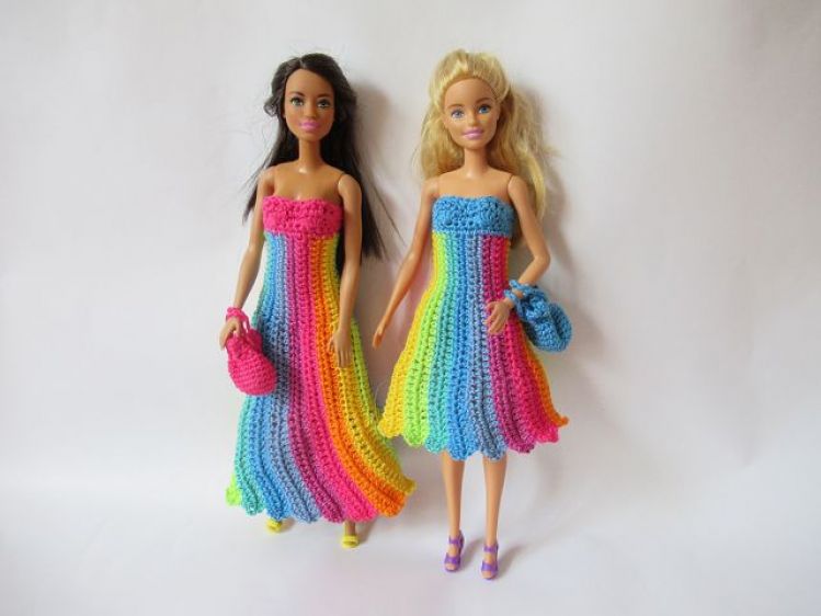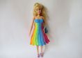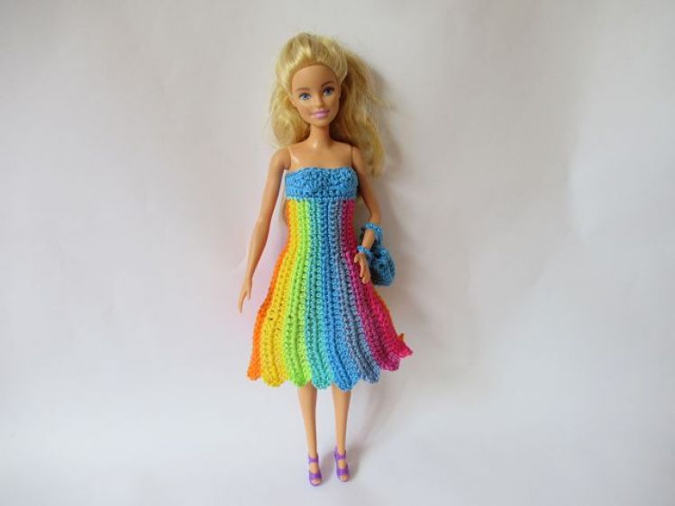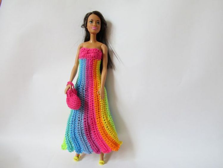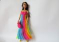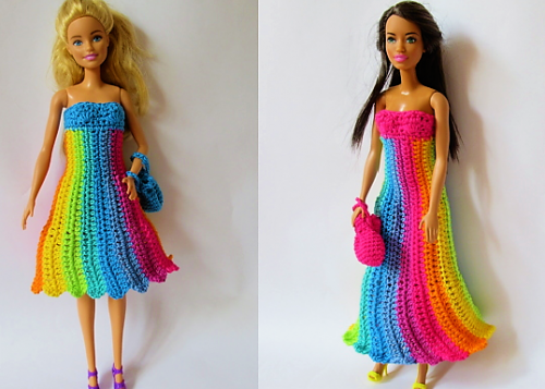 Diese tolle Partykleid für Ankleidepuppen leuchtet in allen Farben des Regenbogens. Du kannst es als kurzes oder als langes Kleid häkeln.