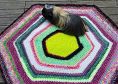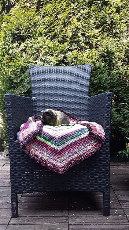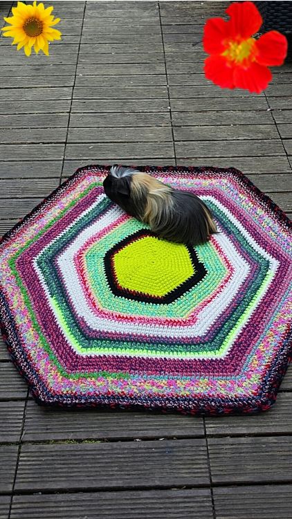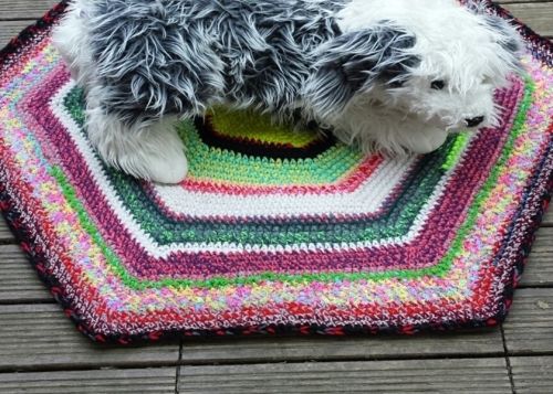 Die abgebildetete Decke ist 78 cm breit und 0,5cm dick. Du brauchst etwa 800gr Restewolle in Stärke 6; alternativ kannst du auch 2 Fäden in Stärke 3 zusammenwickeln und verarbeiten.