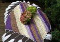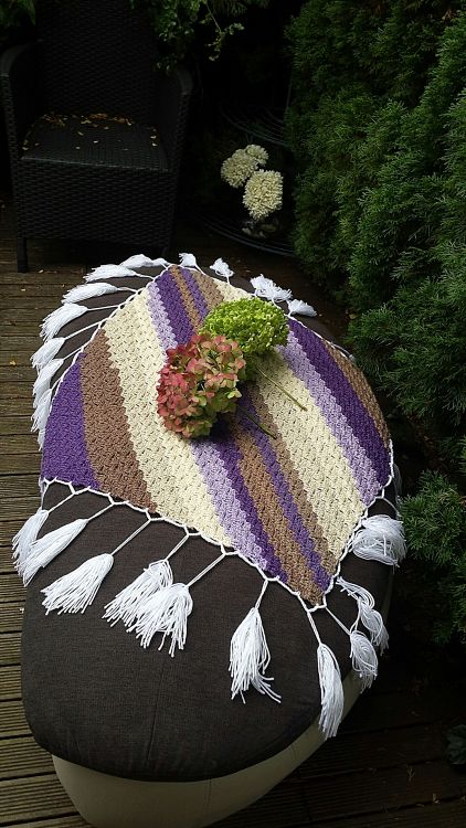 Die fertige Sitzdecke misst 85 cm x 85 cm, zusätzlich messen die Federfransen 20cm.